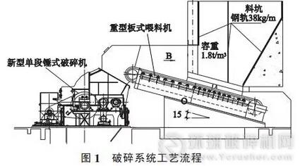 由運(yùn)礦自卸車將石灰石原礦傾倒至破碎料坑內(nèi),由重型板式喂料機(jī)將原礦送入新型單段