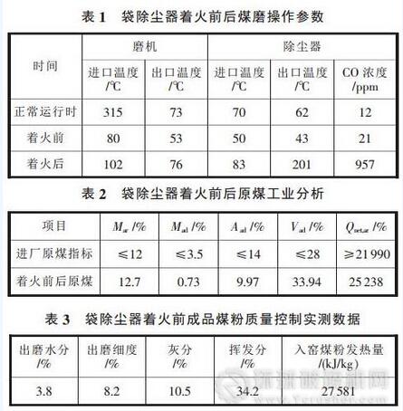 輸送機打到外排。袋除塵器內已經(jīng)著火,濾袋全部被燒,部分袋籠變形。袋除塵器著火前后的操作參數(shù)見表1,原煤工業(yè)分析見表2,成品煤粉實測數(shù)據(jù)見表3。