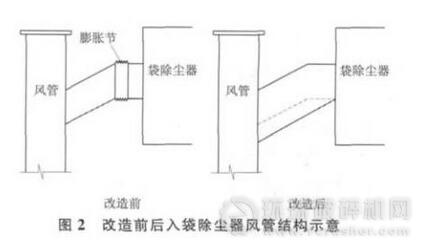 改造入袋除塵器風管,拆除袋除塵器入口處風管上的膨脹節(jié)及底部水平段,并把管道底部斜面在角度不變情況下水平下移、延長,上部連接袋除塵器殼體,下部連接入除塵器上升管道,其余用鐵板密封,使入除塵器的管道底部全部傾斜,避免煤粉堆積。改造前后入袋除塵器風管結構示意見圖2。