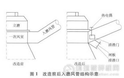 1)改造入磨風管,增大入磨風管角度,由水平提高到40°,當排渣被刮板打到入磨風管內,由于管道傾斜排渣自由滑落回到一次風室,并且入磨風隨傾斜風管進入風室抑制排渣在風管中堆積。改造前后入磨風管結構示意見圖1。