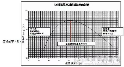 粗略估算,將粉磨介質(zhì)的平均尺寸從25mm降至15mm,可望提高20%的粉磨效率。不過,其假定條件是所有其它重要參數(shù)保持不變。然而事實(shí)上,這種情況并不存在,這是因?yàn)槭褂贸叽绺〉姆勰ソ橘|(zhì)往往會(huì)導(dǎo)致粉磨介質(zhì)(球體)總數(shù)的大幅增長,增加對物料流動(dòng)的阻力,從而導(dǎo)致磨機(jī)內(nèi)物料填充率的提高(提填隙率)。如果填隙率超過85%的最佳值,粉磨效率就會(huì)下降。如果磨內(nèi)糊球嚴(yán)重,粉磨效率會(huì)進(jìn)一步降低。此前"藍(lán)圈水泥技術(shù)中心"也對平均球徑(第二倉)對填隙率的影響開展過研究。