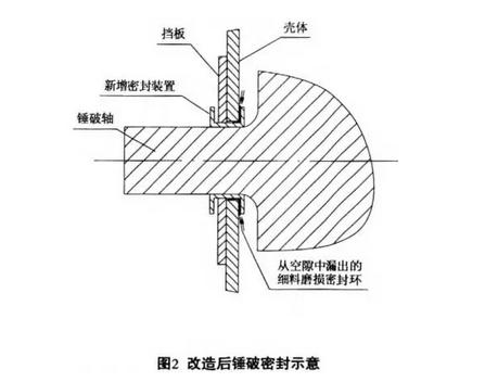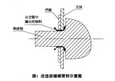 改造前,錘破傳動軸的密封是在殼體與之間加一個單板,如圖1所示。由于錘破殼體與傳動軸之間存在一定間隙(約20 mm),造成熟料顆粒在此處積存,磨損傳動軸,縮短了錘破傳動軸的使用壽命。并且細小熟料顆粒從密封處漏出,影響環(huán)境衛(wèi)生。