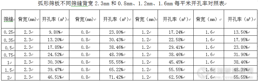 新型高效弧形篩板具有開孔率高、重量輕、耐磨性好、壽命高等優(yōu)點,特別是開孔率較傳統(tǒng)的開孔率提高1倍以上(開孔率對比見下表1),脫水脫介效果好。對于振動弧形篩,安裝高效弧形篩板后,不開振動電機,脫水效果也能達到工藝要求,從而可以降低介耗、電耗。篩板重量變輕也便于更換,減輕了工人更換時的勞動強度,降低篩機負荷,并延長篩機使用壽命。