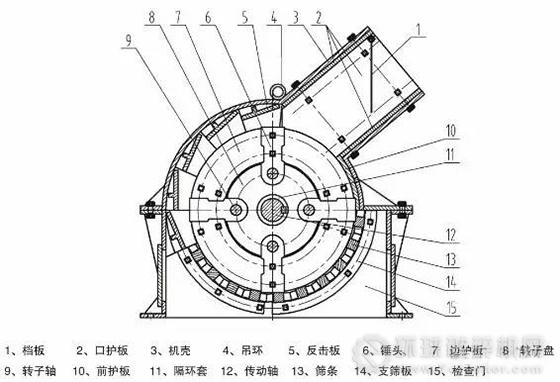 錘式破碎機由箱體、轉(zhuǎn)子、錘頭、反擊襯板、篩板等組成。