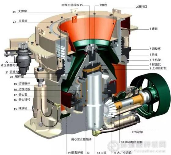 圓錐破碎機其結(jié)構(gòu)主要有機架、水平軸、動錐體、平衡輪、偏心套、上破碎壁(固定錐)、下破碎壁(動錐)、液力偶合器、潤滑系統(tǒng)、液壓系統(tǒng)。