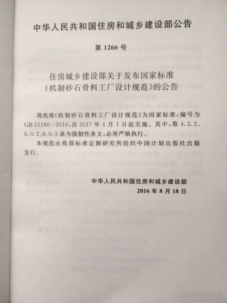 蘇州中材非金屬礦工業(yè)設(shè)計(jì)研究院有限公司、中國(guó)建筑材料工業(yè)規(guī)劃研究院共同主編的《機(jī)制砂石骨料工廠設(shè)計(jì)規(guī)范》由中華人民共和國(guó)住房和城鄉(xiāng)建設(shè)部、中華人民共和國(guó)國(guó)家質(zhì)量監(jiān)督檢驗(yàn)檢疫總局聯(lián)合發(fā)布,2017年4月1日實(shí)施。