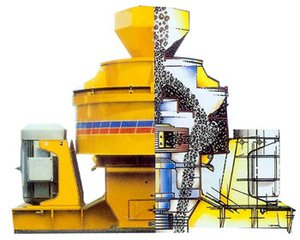 沖擊破是一種利用沖擊能破碎石頭的設(shè)備,因?yàn)槭橇⑤S設(shè)計(jì),也被叫做立軸沖擊破、立式制砂機(jī)。