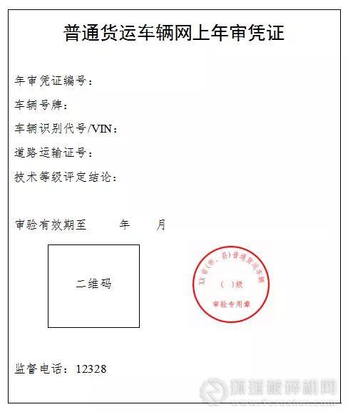 審驗符合要求的,道路貨物運輸經(jīng)營者可通過全國互聯(lián)網(wǎng)道路運輸便民政務服務系統(tǒng)下載《普通貨運車輛網(wǎng)上年審憑證》(參考樣式見附件1)并留存。電子印章(參考樣式見附件1)標注在《普通貨運車輛網(wǎng)上年審憑證》上,由審驗機關加蓋。