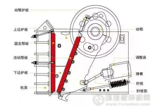 另一對(duì)軸承裝在動(dòng)顎與偏心軸之間,通常稱(chēng)為動(dòng)顎軸承,支承動(dòng)顎在偏心軸回轉(zhuǎn)時(shí)作擺動(dòng)運(yùn)動(dòng),從而實(shí)現(xiàn)活動(dòng)顎板周期性的靠近與遠(yuǎn)離固定顎板。