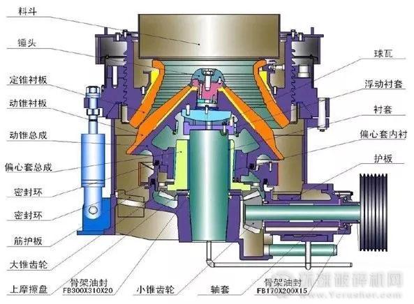該機(jī)的缺點(diǎn)是能耗較高,機(jī)器笨重,產(chǎn)量也偏低。隨著圓錐破日益高能化的發(fā)展方向,該機(jī)也將逐漸被液壓圓錐破取代。