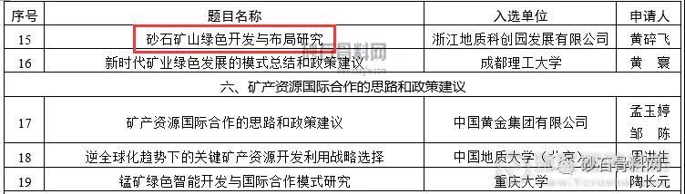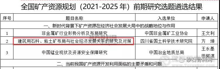 10月8日,自然資源部網(wǎng)站公布全國礦產(chǎn)資源規(guī)劃(2021-2025年)前期研究選題遴選結(jié)果,砂石綠色開發(fā)布局、建筑石料與社會經(jīng)濟(jì)發(fā)展關(guān)系等成功入選!