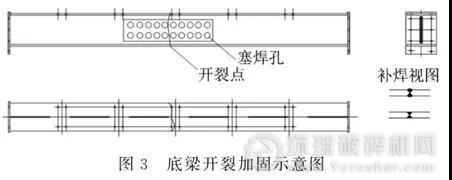 底梁主要在中間部位容易開裂,采用打坡口、焊接平,再加副板的方法解決,通過塞焊和斷續(xù)焊接把副板和底梁固定在一起,能達到預(yù)期目的,延長使用壽命。
