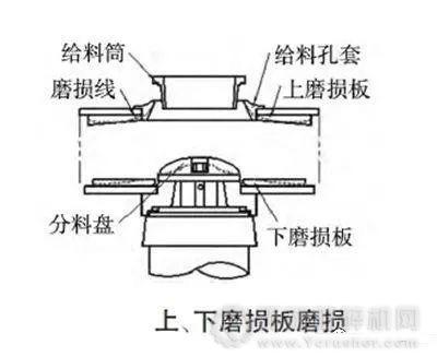 上磨損板非正常磨損主要因給料筒及給料孔套磨損嚴(yán)重,需有針對(duì)性的檢查給料筒及給料孔套的磨損情況并進(jìn)行更換(上磨損板內(nèi)側(cè)邊緣磨損至3mm時(shí)更換),同時(shí)觀察轉(zhuǎn)子拋料頭磨損位置,確定是否受導(dǎo)料板安轉(zhuǎn)位置和安裝角度影響。