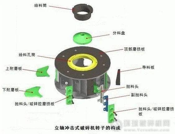 立軸式?jīng)_擊破碎機(jī)轉(zhuǎn)子主要由轉(zhuǎn)子本體、分料盤、給料孔套、導(dǎo)料板、上磨損板、下磨損板以及頂部磨損板等部件組成。
