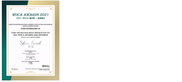 WOCA 地坪獎-亞洲賽區(qū)(WOCA AWARDS)由WOCA 亞洲混凝土世界博覽會頒發(fā),旨在表彰亞洲地區(qū)整體地坪工程質(zhì)量優(yōu)異的地坪項目施工商,并促進亞洲地區(qū)整體地坪工程質(zhì)量的卓越進步。“參評項目包括混凝土面層地坪、水泥砂漿面層地坪、整體樹脂地坪系統(tǒng)三大類(下分13種細分地坪)。“WOCA 地坪獎-亞洲賽區(qū)”(WOCA AWARDS)執(zhí)行國際先進的檢測檢驗標準,對候選項目進行現(xiàn)場性能檢測,依據(jù)三個維度——平整度(FF/FL Testing)、表面耐磨度(BCA Abrasion Testing)、面層粘接強度(Pull-off Adhesion Testing)的測評數(shù)值加權系數(shù)后得出最終分數(shù)進行評選。
