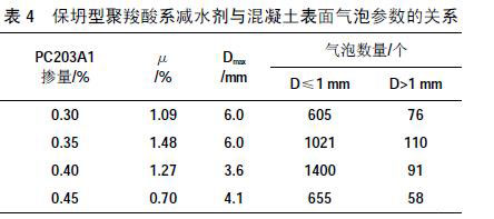 表4為保坍型聚羧酸系減水劑PC203A1摻量分別為0.30%、0.35%、0.40%與0.45%時(shí)的混凝土表面氣泡參數(shù)。