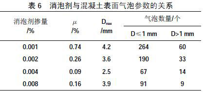 表6為消泡劑摻量分別為0.001%、0.002%、0.004%與0.008%時(shí)混凝土表面氣泡參數(shù),同時(shí)摻入0.25%的PC102B1聚羧酸系減水劑。