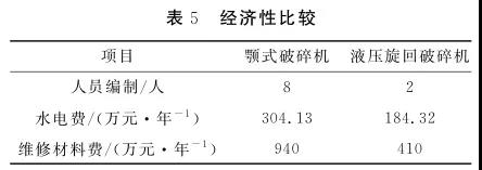 可以看出:液壓旋回破在生產(chǎn)過程中較顎破人員編制可減少75%,材料維修費(fèi)減少56.38%。采用液壓旋回破作為粗碎設(shè)備可在人員工資、能耗和維修費(fèi)等方面為企業(yè)節(jié)約上百萬元成本。