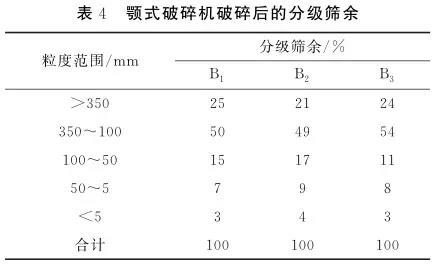 將碎石按照表2中的比例均勻混合后制得6種樣品各1000t,隨機(jī)選取3份通過液壓旋回破,分別編號(hào)為A1、A2、A3。剩余3份進(jìn)入顎破,分別編號(hào)為B1、B2、B3。對(duì)破碎后的物料進(jìn)行篩分,結(jié)果見表3、表4:
