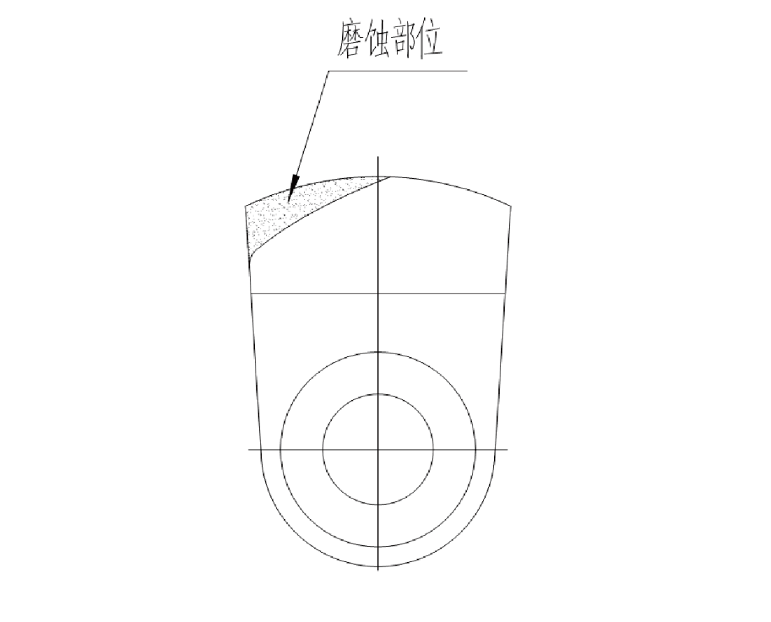 定期檢查錘頭、錘軸、襯板等磨損件的磨損程度,如磨損應及時更換,以免磨壞機殼或轉子盤。錘頭破碎面磨損情況的界定方法:為延長錘頭使用壽命,當錘頭前部棱邊磨損未達到錘頭底部中心線處時應及時翻面,以提高錘頭使用率。磨損情況檢查方法,如下圖所示: