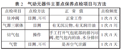 項(xiàng)目與方法如表2所示。儲氣罐、氣源三聯(lián)件中的油水分離器應(yīng)每班排污一次,同時油水分離器應(yīng)每隔3~6個月清洗一次,防止壓縮空氣中過多的水分進(jìn)入氣控閥內(nèi)造成閥芯堵塞導(dǎo)致動作異常,另外儲氣罐內(nèi)一旦存水脈沖時就容易隨脈沖閥噴吹到布袋上去,弄濕布袋,再吸塵時造成板結(jié),時間長了損壞布袋。油霧器應(yīng)經(jīng)常檢查存油情況,及時加油。