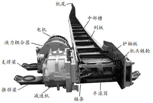 刮板輸送機是由電機、液力耦合器、刮板及鏈條組成的機械裝置,其結(jié)構(gòu)如圖所示。在刮板輸送機運行過程中,電機是刮板輸送機的主要動力來源。通過電機的轉(zhuǎn)動拖動刮板的鏈條運動,帶動刮板運行從而實現(xiàn)裝煤和裝巖。一旦電機燒毀,刮板輸送機將停止運行。