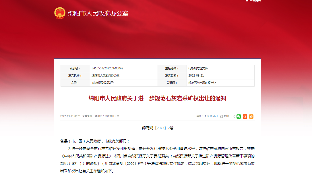 綿陽(yáng)市人民政府關(guān)于進(jìn)一步規(guī)范石灰?guī)r采礦權(quán)出讓的通知綿府規(guī)〔2022〕2號(hào)