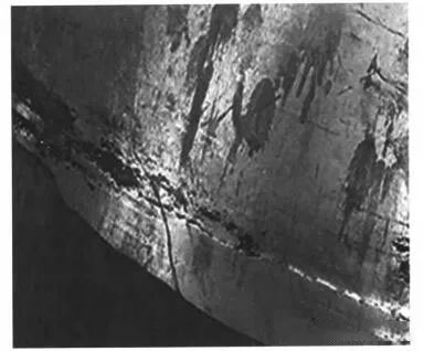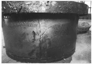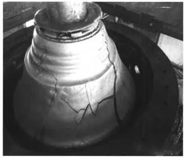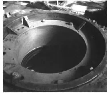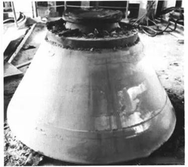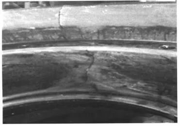 動錐襯板裂紋如圖2所示,上、下架體止口配合面磨損如圖3所示。