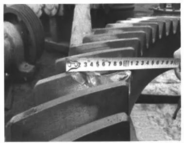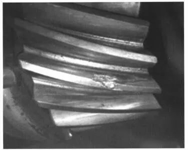 破碎機(jī)過鐵瞬間傳動齒輪嚙合受到?jīng)_擊,易造成打齒。大齒輪損傷如圖8所示,小齒輪損傷如圖9所示。