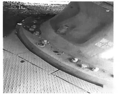 上架體襯套外表面涂抹修補(bǔ)劑如圖12所示,焊接加固肋板如圖13所示。
