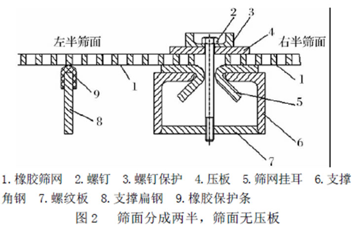 (1)大多的篩分設(shè)備制造廠,在制造篩子時(shí),為了提高有效篩分面積,都把篩網(wǎng)的支撐梁設(shè)計(jì)成一根側(cè)立的鋼板,再在鋼板上壓一塊或襯一塊橡膠保護(hù)條(如圖1所示)。由于支撐梁太小,所以上面沒法再加裝壓板。