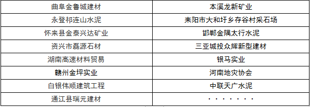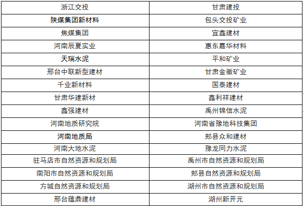 河南省地質(zhì)局、湖州市自然資源和規(guī)劃局、南陽市自然資源和規(guī)劃局、駐馬店市自然資源和規(guī)劃局、許昌市自然資源和規(guī)劃局、鶴壁市自然資源和規(guī)劃局、禹州市自然資源和規(guī)劃局、郟縣自然資源和規(guī)劃局、方城縣自然資源和規(guī)劃局、中化地質(zhì)礦山總局河南地質(zhì)局、中化地質(zhì)礦山總局湖北地質(zhì)勘查院、河南建筑材料研究設(shè)計院有限責(zé)任公司、中國電建集團華東勘測設(shè)計研究院有限公司、中材(南京)礦山研究院有限公司、天津水泥工業(yè)設(shè)計研究院、蘇州中材非礦設(shè)計院、煤炭工業(yè)鄭州設(shè)計研究院、西安建筑科技大學(xué)、河南省地災(zāi)害防治和生態(tài)保護修復(fù)協(xié)會、河南省礦業(yè)協(xié)會、河南省建筑材料工業(yè)協(xié)會、湖北省砂石協(xié)會、廣東省砂石協(xié)會、河北省砂石協(xié)會、貴州省砂石協(xié)會、福建省砂石協(xié)會、遼寧省砂石協(xié)會、湖南省砂石協(xié)會、上海市砂石協(xié)會、重慶市砂石協(xié)會、江西省砂石協(xié)會、陜西省砂石協(xié)會、甘肅省砂石協(xié)會、郟縣砂石協(xié)會、焦作市投資集團有限公司、河南省大地水泥集團、湖北鄂東礦業(yè)投資集團有限公司、湖北省工建集團、中電建河南萬山綠色建材有限公司、浙江德清恒鑫投資公司、福州松下碼頭有限公司、湖北潤楊礦業(yè)發(fā)展有限公司、焦作千業(yè)新材料有限公司、武穴市東南礦業(yè)有限公司、泌陽中聯(lián)新材料有限公司、邢臺縣蘊鼎建材有限公司、駐馬店市豫龍同力水泥有限公司、固始金山石料有限公司、確山縣誠元骨料有限公司、郟縣眾和建材有限公司、郟縣中聯(lián)天廣水泥有限公司、天瑞集團股份有限公司(許昌)、禹州市錦信水泥有限公司、禹州市國泰建材有限公司、河南盛源礦業(yè)有限公司、禹州市禹鑫建材有限公司、禹州市宜鑫建材有限公司、禹州市平和建材有限公司、大連天瑞水泥有限公司、本溪三合礦業(yè)有限公司、本溪明山區(qū)馨利石灰石礦有限公司、贛州金坪石業(yè)有限公司等等;