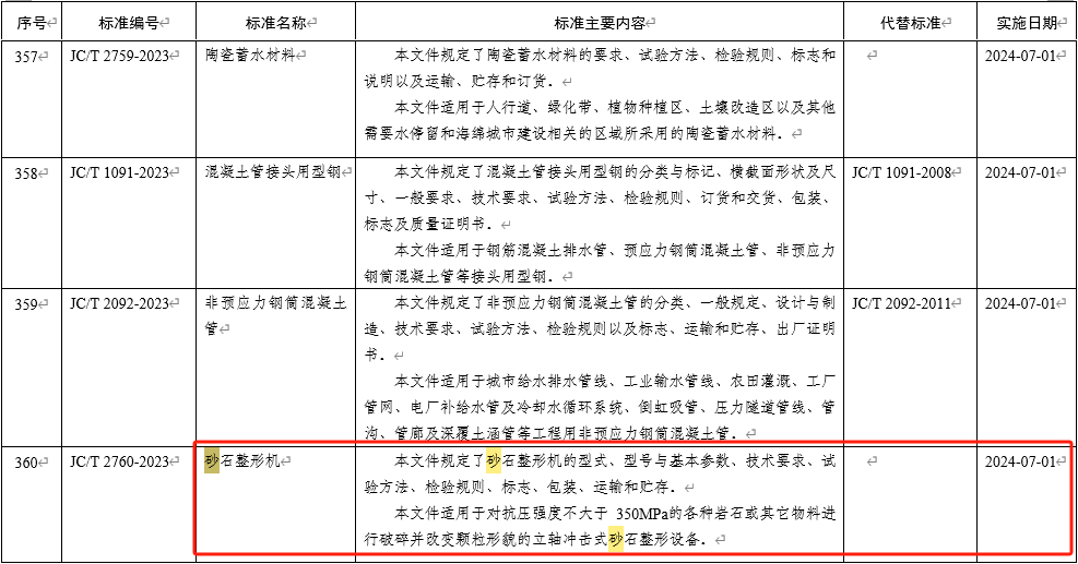 近日,工業(yè)和信息化部發(fā)布了《中華人民共和國工業(yè)和信息化部公告2023年第38號》,批準了《砂石整形機》、《建筑材料用移動式破碎站》等1276項行業(yè)標準,其中包括國家建筑材料工業(yè)機械標準化技術委員會歸口管理的JC/T 2760-2023《砂石整形機》、JC/T 2787-2023《建筑材料用移動式破碎站》、JC/T 720-2023《蒸壓釜》、JC/T 820-2023《水泥工業(yè)用空氣輸送斜槽》、JC/T 2785-2023《發(fā)泡陶瓷隧道窯》、JC/T 2786-2023《水泥工業(yè)用V型靜態(tài)選粉機》、JC/T 921-2023《蒸壓加氣混凝土設備 切割機組》建材機械行業(yè)標準,自2024年7月1日起實施。