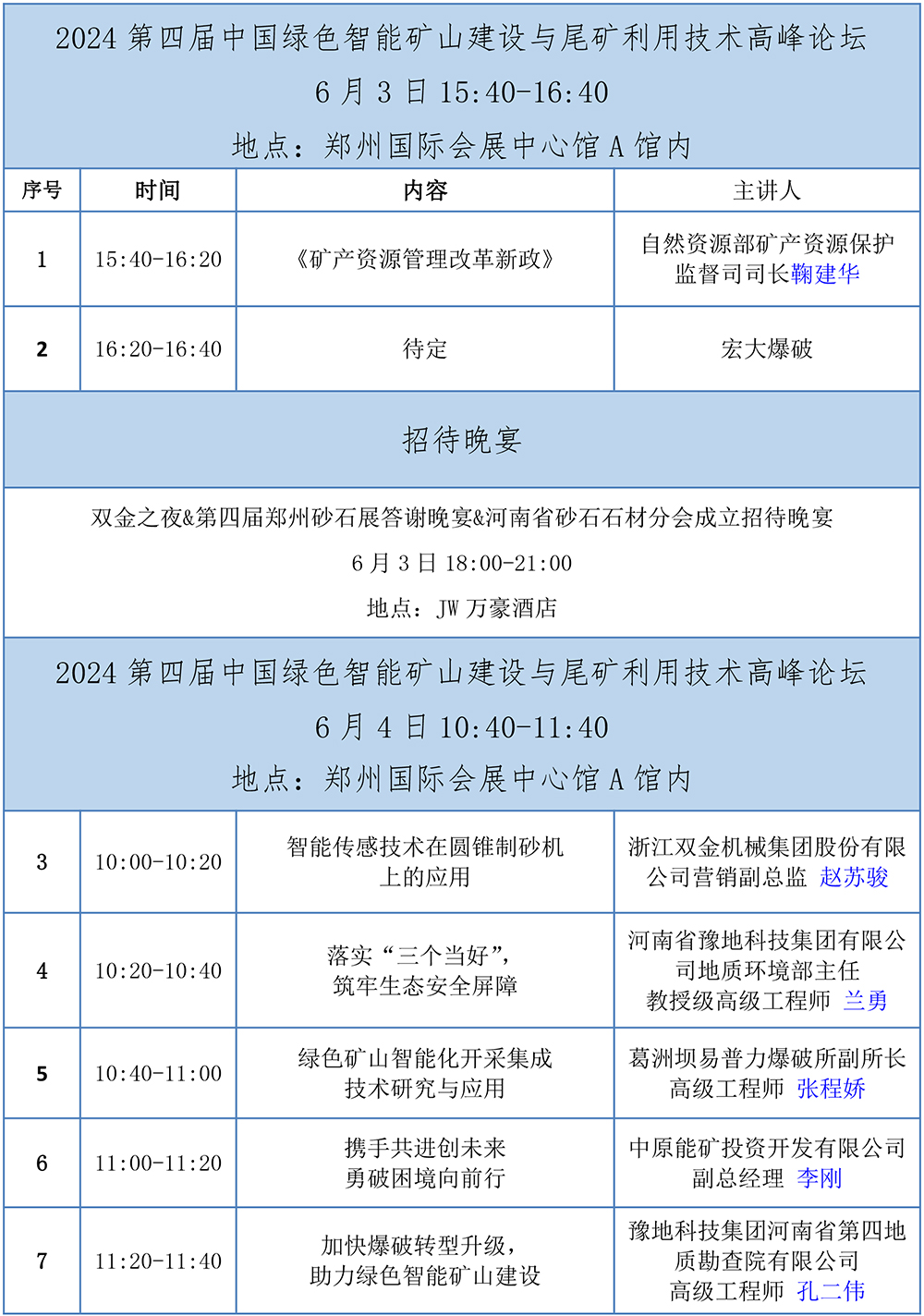 由河南省礦業(yè)協(xié)會(huì)、河南省自然資源投資集團(tuán)、河南省豫地科技集團(tuán)、河南省地質(zhì)研究院、環(huán)球破碎機(jī)網(wǎng)聯(lián)合主辦的“2024第四屆中國(guó)綠色智能礦山建設(shè)與尾礦利用技術(shù)高峰論壇”,將于2024年6月3日-5日在河南鄭州舉辦,同期舉辦“第四屆中國(guó)(鄭州)砂石及尾礦與建筑固廢處理技術(shù)展覽會(huì)”、“礦業(yè)先進(jìn)技術(shù)裝備展”、“河南礦業(yè)協(xié)會(huì)砂石石材分會(huì)成立大會(huì)”等活動(dòng)。